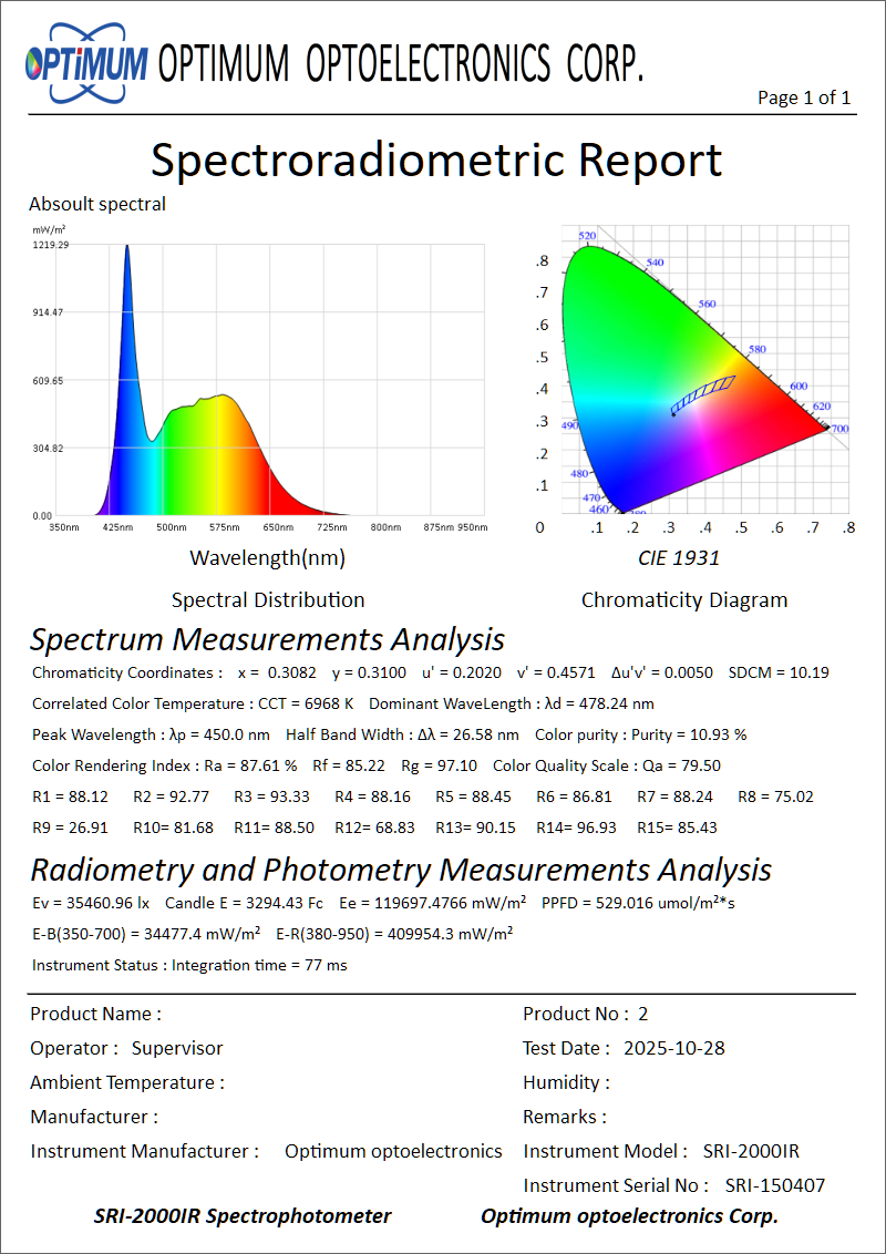 SRI-2000 是一台多功能且簡易操作的光譜照度計,是市面上唯一利用光譜儀做手持照度功能的量測儀器,無須透過電腦即可精確的測量”各類型”發光產品(例如:LED、OLED、植物燈、鹵素燈、無影燈、螢光燈...),適合照明安裝人員、設計師和工程師、建築及室內設計、舞台設計各種照明應用,更可用於實驗室研究等之儀器。