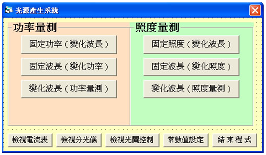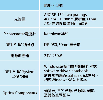 本系統提供各種絕對照度與功率之單色或全光譜均勻光源。藉由積分球的功能產生的均勻光源,及設計精良的光源箱可提供均勻光源達14mm直徑及均勻三色光源(R.G.B)。 本套系統可提供波長,功率及照度的全功能自動控制量測。 達到需要的待測物光源波長、照度及功率的量測。 本系統由積分球、光譜儀、微電流計及電腦控制為主要元件,搭配獨家開發之控制光學軟體,在簡易的操作介面之下,降低色溫誤差,提高測試準確度。並可達到自行校正波長及照度校正功能。 選用本系統進行光源相關研發工作之客戶包括已有科學園區多家廠商。
